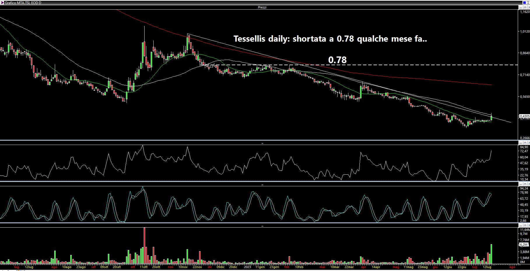 In settimana le azioni Tessellis hanno chiuso l'aumento di capitale. Le nuove azioni sono state emesse a 0.40 euro ed il titolo è SEMPRE stato sotto questo livello. Solo nella seduta di venerdì ha trovato il coraggio di spingersi al di sopra di tale soglia e fino a 0.45 euro. Personalmente sono arbitraggiato esattamente da 0.45 euro, mentre le azioni sono state shortate a 0.78 euro. E'stato un trade che mi porto dietro da oltre sei mesi e che ho lasciato correre bene, quindi penso che in settimana chiuderò tutto oppure una delle due gambe (con ogni probabilità quella short) e sulla parte long adotterò comunque uno stop sotto 0.40 moc. La situazione ottimale sarebbe un tentativo di congestione tra 0.40 e 0.45 per almeno un paio di sedute in modo da chiudere lo short che ha portato ad un guadagno percentuale superiore al 40% e "giocarmi" qualche punto percentuale (2-3%) sulla gamba long. Non sono esperto di aumenti di capitale ma la mia sensazione è che siano stati tagliati fuori tutti i piccoli azionisti (del resto se l'aumento è a 0.40 e il titolo rimane sotto questo livello chi è l'investitore retail che sottoscriverà le nuove azioni dopo un crollo del genere???) e chi ha sottoscritto non vede l'ora di vendere e quindi può avere tutto l'interesse nel far salire un pò il titolo, magari grazie all'uscita di qualche buona notizia. Di certo NON voglio essere investitore di lungo periodo. Ad ogni modo è stato certamente un ottimo trade di questo 2023.