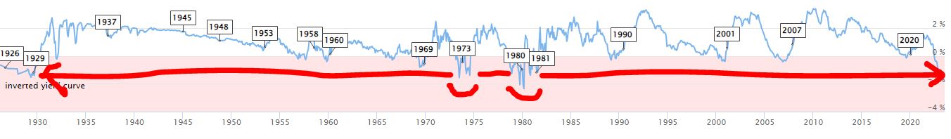 Curiosamente oggi la curva dei rendimenti è invertita esattamente come lo era alla fine degli anni '20, ma lo è stata di più nel 1974 e all'inizio degli anni '80.