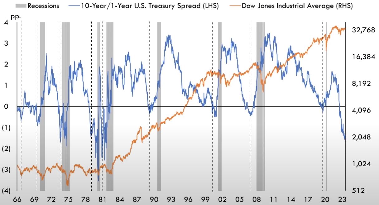 Riassumendo ed in estrema sintesi: l'inversione della curva dei rendimenti è anticipatrice di recessioni, anche se nella storia ci sono state recessioni a prescindere dall'inversione stessa. Quando la curva è invertita ci sono stati casi di recessioni che si sono sviluppate nel giro di pochissimo tempo ed altri in cui quel tempo è stato al massimo di 16-18 mesi. Il tempo che intercorre tra l'inizio dell'inversione della curva dei rendimenti e l'inizio della recessione non ci dice quanto quella recessione potrà essere profonda, ma lo possiamo intuire osservando la profondità dell'inversione stessa. La curva si è invertita ad agosto del 2022 e ad oggi lo è ancor di più.