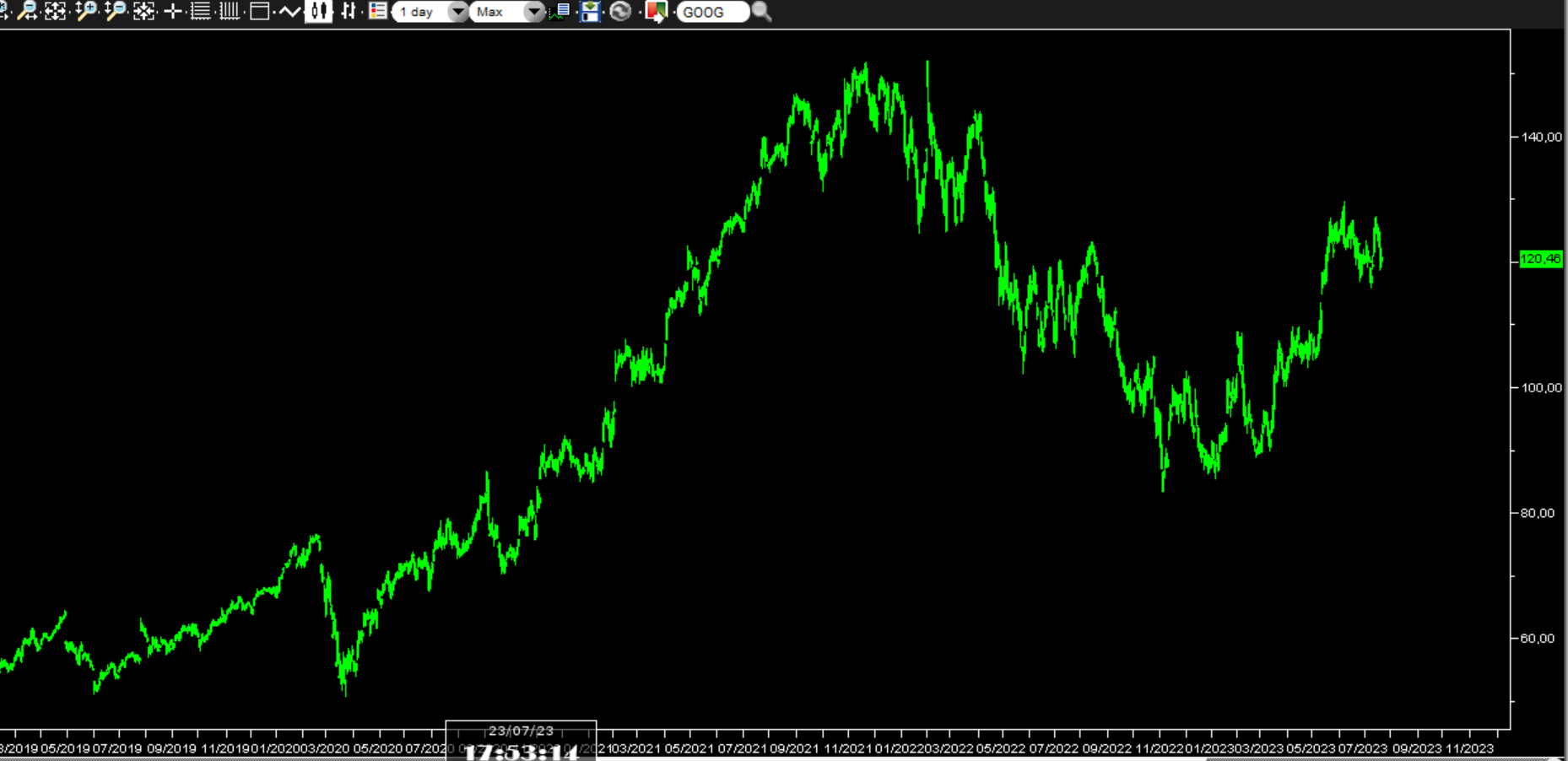 Google balla da un pò tra i 127 $ e i 117 $ ma il vero valore da monitorare come bussola è ai 110 $.