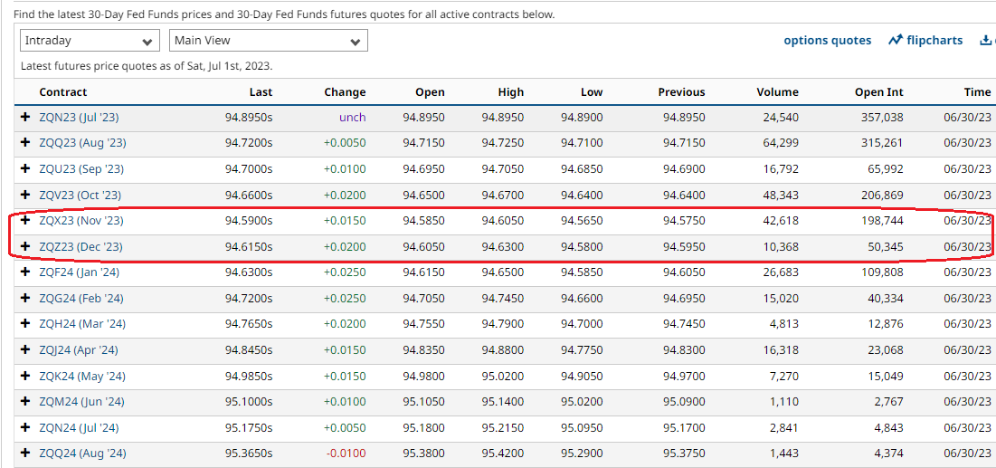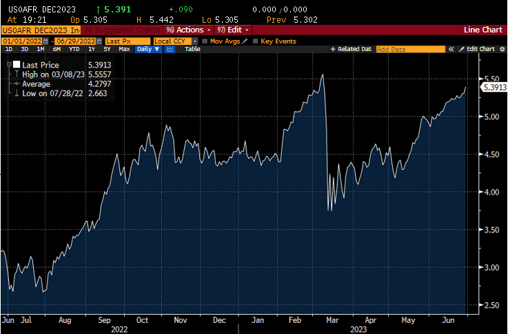 I dati macro usciti in settimana hanno evidenziato, in generale, che l'economia USA non sembra in procinto di rallentare significativamente (concetto che al momento non può essere esteso all'Europa) e se i bonds credevano di aver passato indenni le forche caudine dei banchieri centrali riuniti a Sintra con dichiarazioni aggressive circa la politica dei tassi, hanno dovuto prendere invece atto di questa grandinata di sorprese positive, anche sull'inflazione. Pertanto ora i Fed Funds strip sono andati a scontare una probabilità dell'85% di un rialzo dei Fed Funds a luglio e un altro 40% di un ulteriore rialzo da 25 bps entro novembre, mentre per il FOMC di dicembre, che mesi fa era indicato dai futures sotto al 4%, ora sconta Fed Funds più alti di quelli attuali, avendo quasi recuperato i livelli precedenti la crisi bancaria (v. grafico):