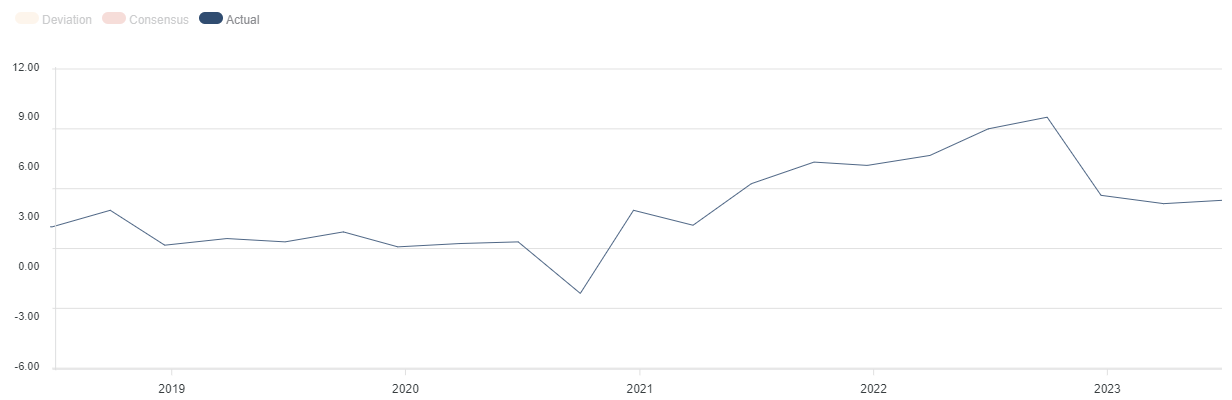 L’indice dei prezzi PIL nel primo trimestre 2023 è al 4,1%, in leggero rialzo rispetto alla rilevazione del 3,9% dell’ultimo trimestre 2022. Il dato è rilasciato dall’U.S. Bureau of Economic Analysis.