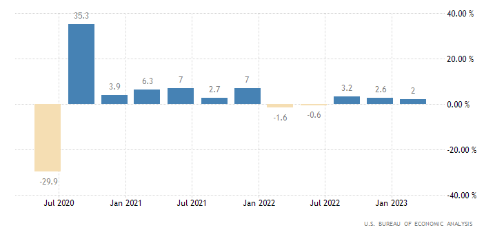 Il dato relativo al primo trimestre 2023 del PIL annualizzato si attesta al 2%, in calo rispetto all’ultimo trimestre del 2022 che aveva fatto registrare una rilevazione del 2,6%. Il secondo dato preliminare del primo trimestre 2023 era fissato all’1,3%. Il dato è rilasciato dall’U.S. Bureau of Economic Analysis.