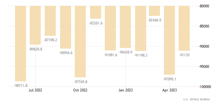 Il dato preliminare di maggio relativo alla bilancia commerciale dei beni si attesta a -91,13 miliardi di dollari contro la rilevazione di -97,10 miliardi di dollari di aprile (rivista da -96,77 miliardi di dollari). Il dato è rilasciato dall’U.S. Census Bureau.
