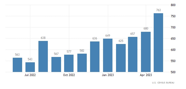 Le vendite di nuove case passano dal dato di 680 mila unità di aprile (rivisto da 683 mila) a quello di maggio di 763 mila unità, registrando una crescita del 12,2% ed andando ben oltre al consensus fissato a 675 mila. Il dato è rilasciato dall’U.S. Census Bureau.