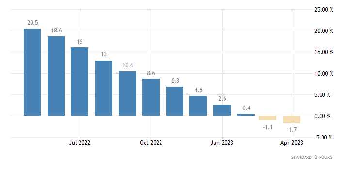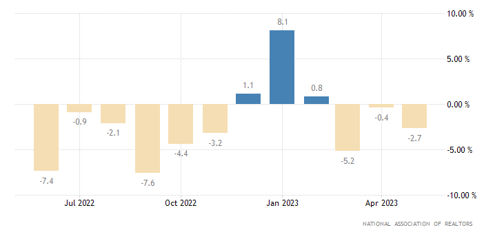 A livello mensile, a maggio il dato sulle vendite immobiliari in corso (che misura il cambiamento nel numero di case con contratto di vendita, ma in attesa della transazione di chiusura, escludendo le nuove costruzioni) incassa un -2,7%, contrazione al -0,4% di aprile (rivisto da +0,0%). Il dato è rilasciato dalla National Association of Realtors.