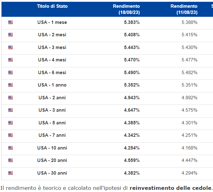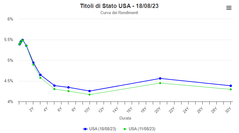 Uno dei driver delle sedute negative di Wall Street continuano ad essere i rendimenti dei Treasury statunitensi che hanno chiuso la sessione con una performance mista. Il rendimento a 10 anni ha raggiunto un picco al 4,328%, il livello più alto dal 2007, prima di scendere leggermente in chiusura di settimana, mentre il rendimento a 30 anni è salito al 4,426%, il più alto dal 2011. Mentre il 2 anni ha superato di poco il 5% e solo in intraday per poi scendere al 4,949% con il risultato che la curva si sta sempre più disinvertendo (2-10Y a 69 bps dai 73 di due venerdì fa) ma sempre a causa del rialzo dei rendimenti sulla parte lunga. L'indice del dollaro USA ha chiuso la giornata stabile a 103,40 dopo aver raggiunto massimi di due mesi a 103,59.
