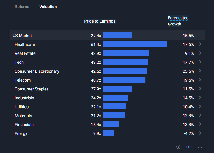 Gli investitori preferiscono il settore sanitario per la crescita futura, che viene scambiato al 61,4x al di sopra del suo rapporto PE medio a 3 anni di 49,4x. La fiducia del mercato è probabile perché gli analisti prevedono una crescita annuale degli utili del 17,6%, che è superiore al calo degli utili dell'anno scorso del 4,7% annuo. Il settore Energia è il meno preferito dagli investitori per la crescita futura. Tuttavia, il sentimento degli investitori sembra essere migliorato dato che viene scambiato al di sopra della sua media triennale di 2,0 volte.