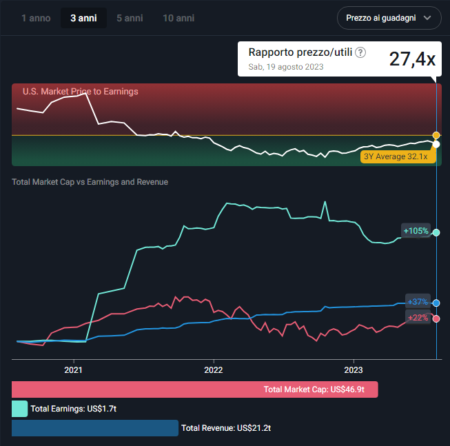 Gli investitori sono pessimisti sul mercato americano, indicando che prevedono che gli utili non cresceranno così velocemente come storicamente. Il mercato è scambiato a un rapporto PE di 27,4x, che è inferiore al suo PE medio a 3 anni di 32,1x. Gli utili delle società quotate americane sono cresciuti del 27% all'anno negli ultimi tre anni. I ricavi di queste società sono cresciuti dell'11% all'anno. Ciò significa che nel complesso queste società generano più vendite e, di conseguenza, aumentano anche i loro profitti.
