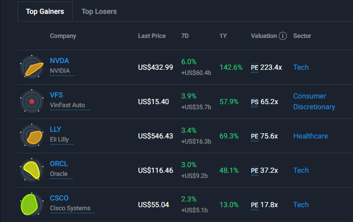 Queste le aziende che hanno guidato il mercato negli ultimi 7 giorni al rialzo: