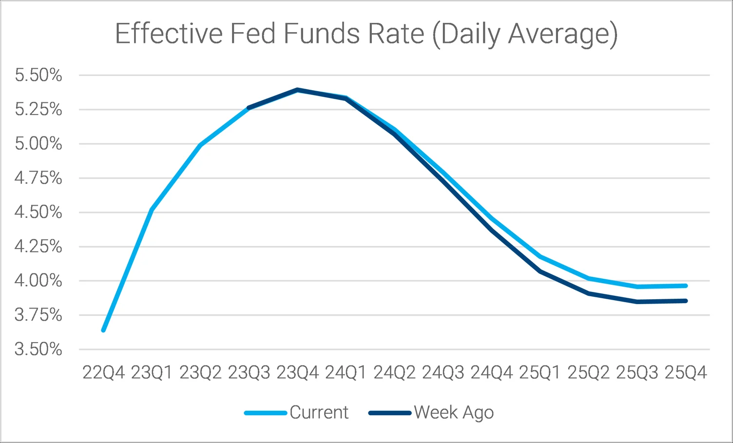 il tasso effettivo medio implicito sui Fed Funds per il quarto trimestre del 2024 è salito al 4,46%, in rialzo di 11 bps nella settimana (e di 21 bps nelle ultime due settimane). I futures attualmente implicano la probabilità del 44% di un aumento di 25 bps tra novembre e dicembre secondo lo strumento FedWatch del CME e stimano che un primo taglio dei tassi possa avverarsi alla riunione del FOMC del 1° maggio.