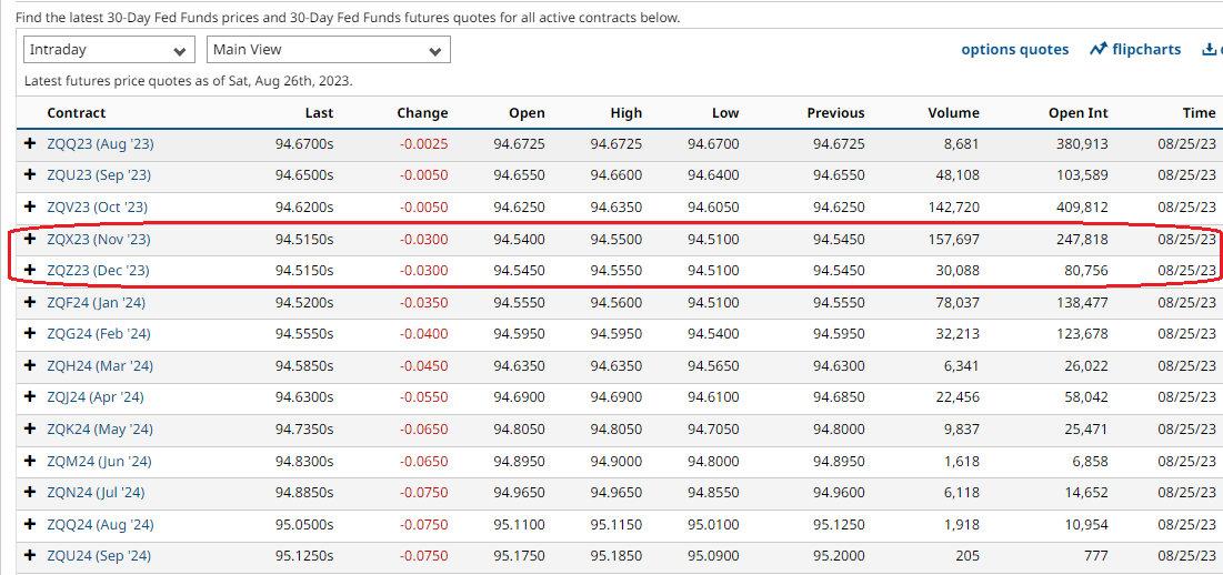 A livello di politica monetaria, le dichiarazioni di Powell a Jackson Hole hanno descritto la situazione economica in modo tale che, anche se i membri della FED sospettano che non sarà necessario aumentare nuovamente i tassi, specialmente considerando che gli effetti completi dei rialzi già effettuati devono ancora colpire l'economia, non vogliono togliere l'opzione di ulteriori rialzi nel caso l'inflazione dovesse tornare a salire nella direzione sbagliata. Un altro motivo è che non appena la FED dichiarerà che probabilmente non alzerà più i tassi, l'attenzione degli investitori si sposterà rapidamente su quando la FED potrebbe iniziare a tagliarli. Se ciò accadesse, i tassi di interesse a lungo termine in particolare potrebbero iniziare a scivolare, fornendo un nuovo impulso all'economia per il quale i responsabili delle politiche non sono ancora del tutto pronti. Più tempo la FED lascia aperta la possibilità di aumentare i tassi, senza farlo effettivamente, meno probabile è che gli investitori inizino a immaginare una rapida serie di tagli dei tassi. Infatti i futures sui Fed Funds continuano ad assumere un atteggiamento accomodante anche se, dopo le dichiarazioni di Powell, il ritmo e il grado di allentamento implicito nei futures sui Fed Funds hanno ripreso a moderarsi (v. grafico):