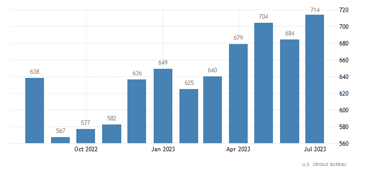 Le vendite di nuove case a livello mensile registrano un incremento del 4,4% passando dal dato di 684 mila unità di giugno (rivisto da 697 mila) a quello di luglio di 714 mila. Il consensus indicava un rialzo più contenuto a quota 705 mila. Il dato è rilasciato dall’U.S. Census Bureau.