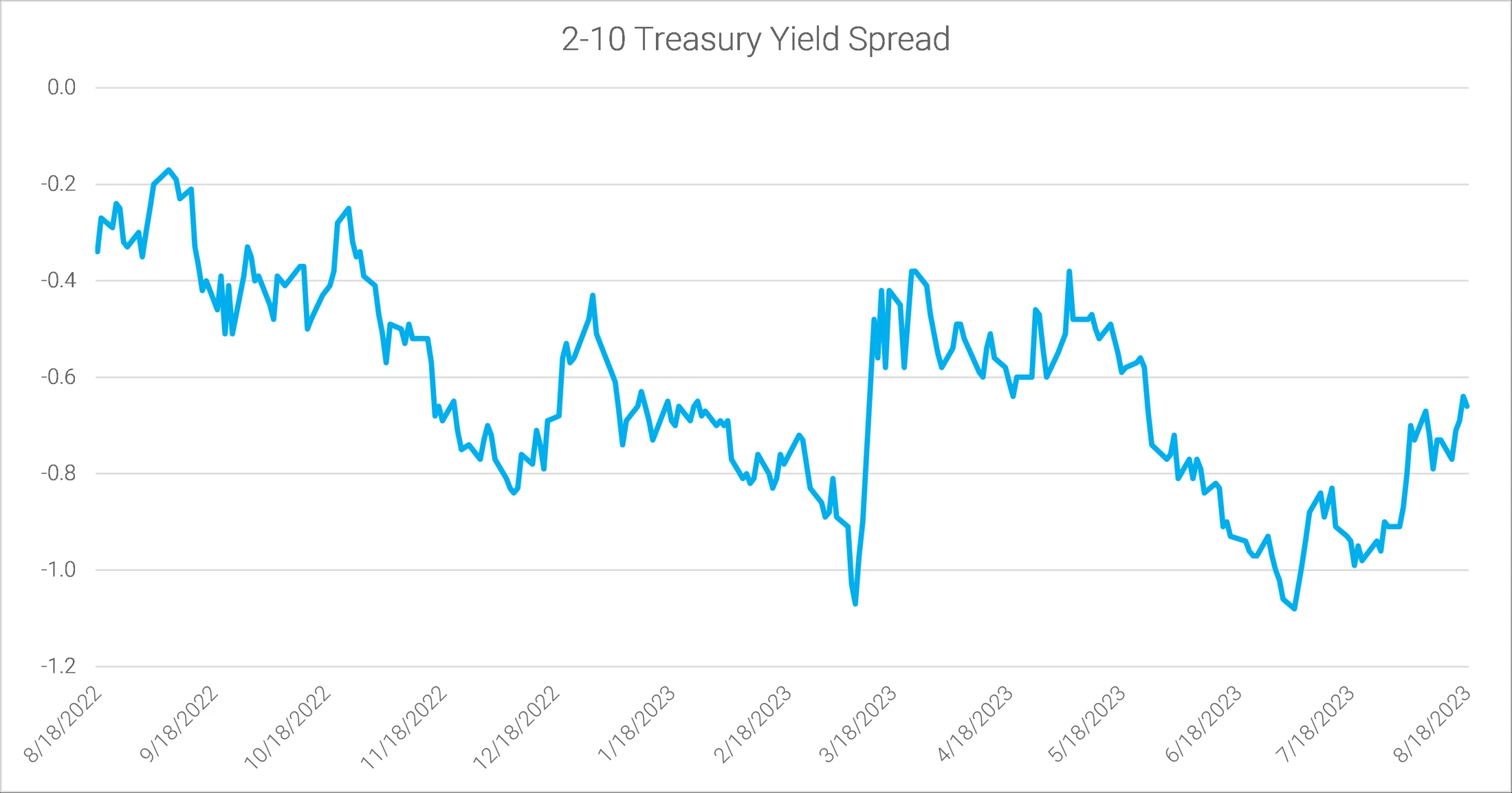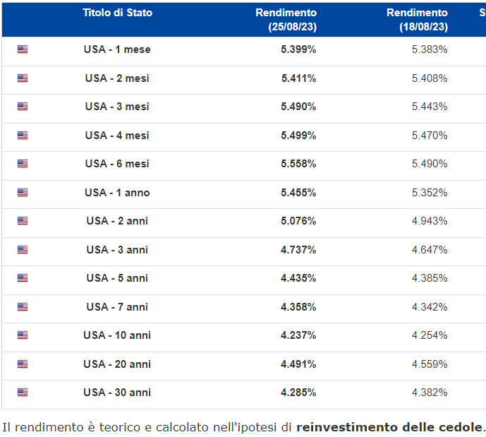 In reazione al discorso di Powell, il rendimento del Treasury a 2 anni è aumentato di oltre lo 0,80% portandosi al 5,08%, mentre il Treasury a 10 anni ha subito una netta inversione dal massimo di martedì scorso a 4,362% chiudendo la settimana al 4,239% aumentando così lo spread tra 2 e 10 anni da 66 bps a 84 bps.