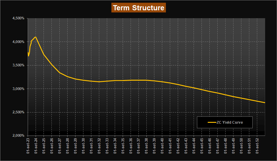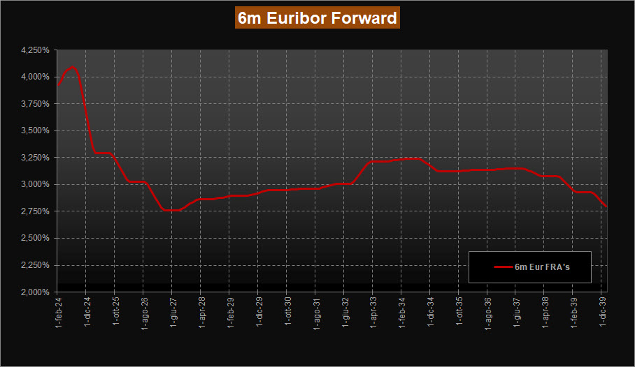 La lettura della ZC-Yield Curve mostra ancora una lieve salita dei rendimenti sul tratto della curva a medio e a lunga rispetto alla scorsa analisi. Infatti, rispetto alla scorsa lettura il rendimento della scadenza a 10 anni sale in area 3,16% rispetto al 3,12% precedente, mentre la scadenza trentennale sale in area 2,70% rispetto al precedente 2,64%. Sempre immutata la conformazione della curva, che rimane invertita con un differenziale 10Y-2Y stabile agli attuali -57 bps dai precedenti -56 bps. In lieve discesa il tratto a breve, con la curva che evidenzia ora un massimo di rendimento sulle scadenze di metà 2024 in area 4,10% rispetto al 4,15% della scorsa analisi. Ridimensionamento anche per le previsioni dei tassi forward su Euribor 6 mesi sulle scadenze a breve. La curva rimane impennata e vede ora i tassi attesi in area 4,10% per metà 2024, per poi scendere sotto al 3,00% solo verso fine 2026 e riprendere a salire progressivamente verso area 3,25% a partire dal 2027.