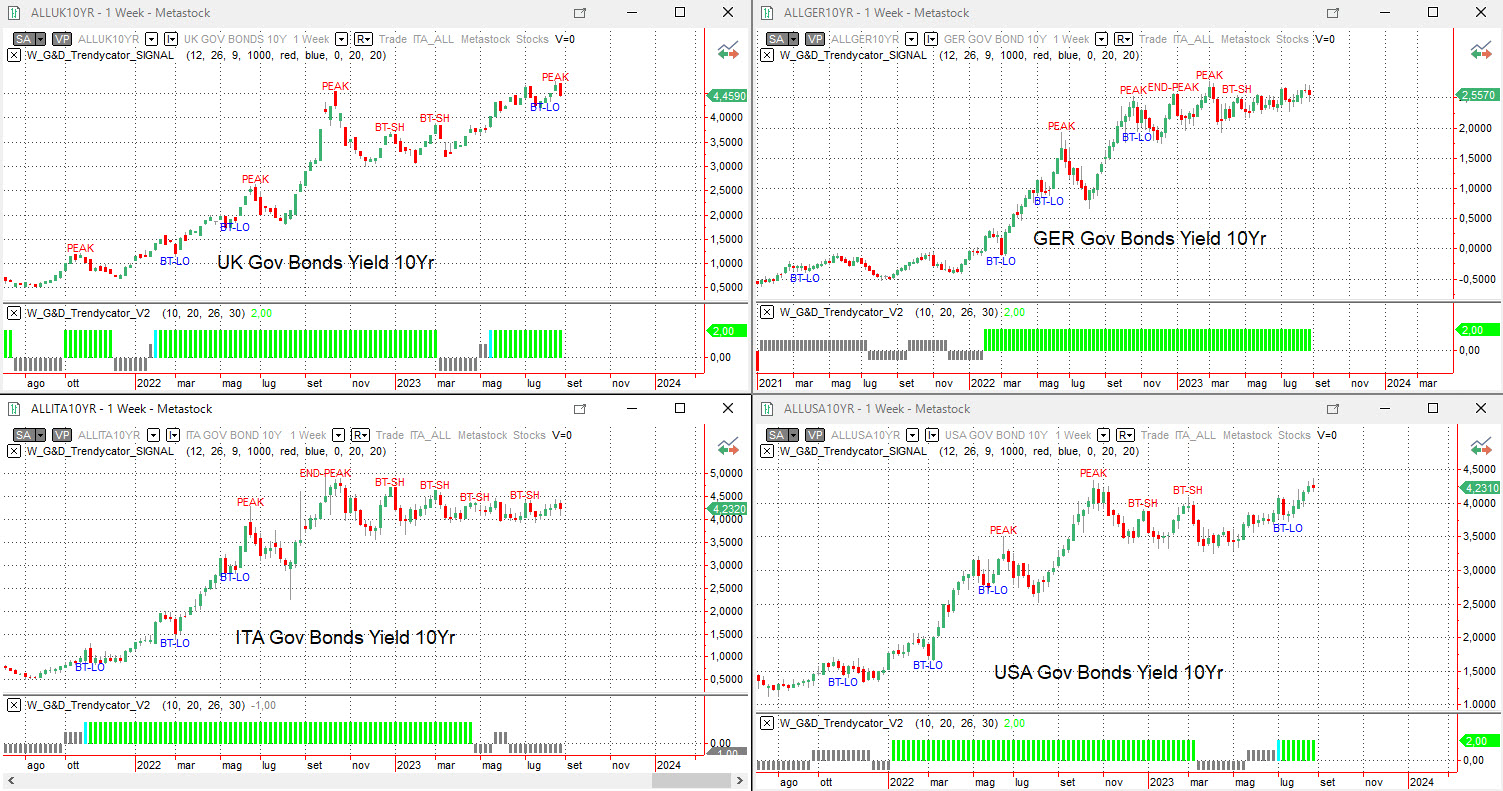 Osservando – a livello di analisi integrata – le curve dei rendimenti dei principali benchmark decennali si evidenzia ancora una sorta di lateralità sui rendimenti delle diverse aree valutarie. L’area UK vede il rendimento per il GILT in lieve rialzo in area 4,46% dal precedente 4,37% e con Trendycator che si conferma in stato LONG. Ritoccano lievemente al rialzo anche i rendimenti del BUND, che si porta ora in area 2,56% rispetto al precedente 2,52% e con Trendycator che si mantiene stabilmente in stato LONG. In aumento anche i rendimenti del nostro Btp decennale, ora in area 4,23% con uno spread in area 166 bps e modello Trendycator che si conferma in stato NEUTRAL. Infine, l’area USA con i rendimenti del Treasury decennale che continuano a salire e si portano al 4,23% ad un soffio dai precedenti massimi in area 4,30% registrati a a fine 2022, con Trendycator che si conferma in stato LONG.
