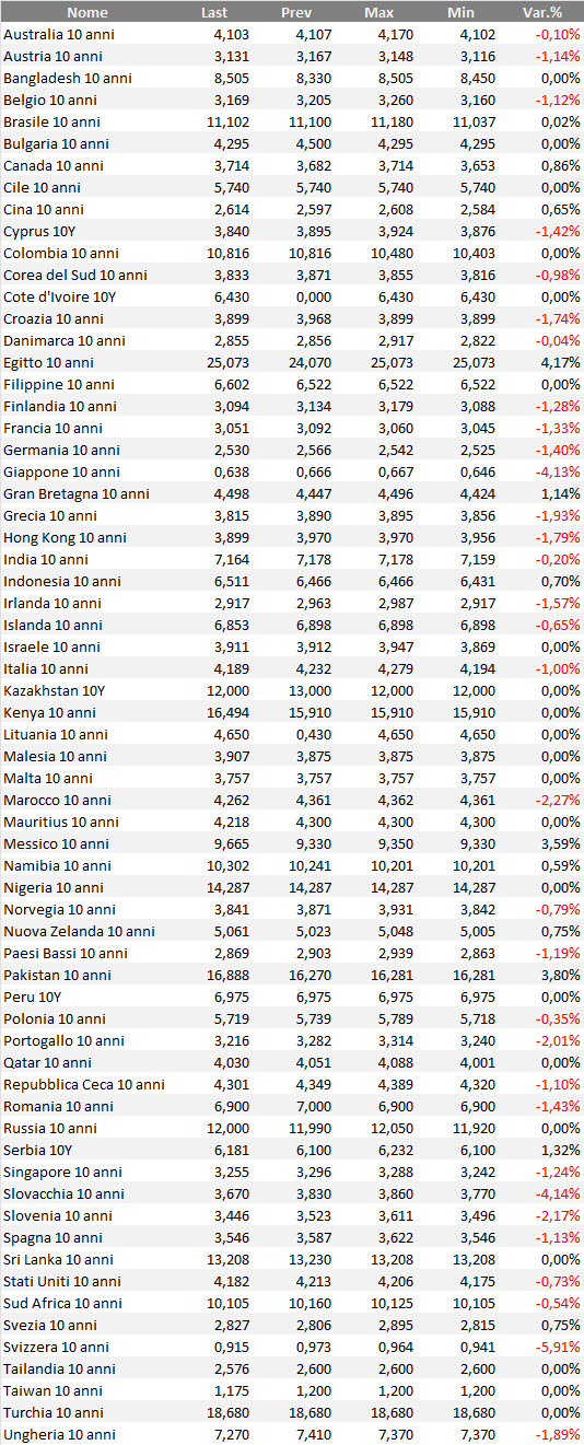 Consueta sezione dell’analisi sui mercati obbligazionari, con l’introduzione sotto forma di ranking dei bond governativi mondiali con qualunque rating. In alcuni casi, per alcuni emittenti o per alcune valute, il rapporto rischio/rendimento di questi bond può essere anche piuttosto speculativo. Il ranking considera i bond benchmark decennali in tutte le valute di emissione.