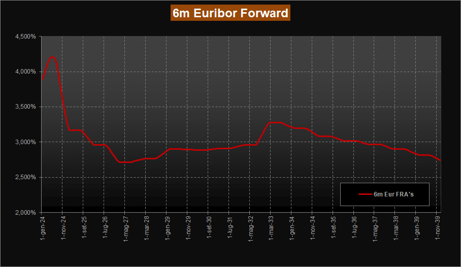 La lettura della ZC-Yield Curve mostra ancora una salita dei rendimenti sul tratto della curva a medio e a lunga rispetto alla scorsa analisi. Infatti, rispetto alla scorsa lettura il rendimento della scadenza a 10 anni sale in area 3,12% rispetto al 3,03% precedente, mentre la scadenza trentennale sale in area 2,64% rispetto al precedente 2,51%. Sempre immutata la conformazione della curva, che rimane invertita e con un deciso restringimento del differenziale 10Y-2Y che è passato agli attuali -56 bps da precedenti -70 bps. In lieve discesa il tratto a breve, con la curva che evidenzia ora un massimo di rendimento sulle scadenze di metà 2024 sempre in area 4,15% rispetto al 4,20% della scorsa analisi. Ridimensionamento anche per le previsioni dei tassi forward su Euribor 6 mesi sulle scadenze a breve. La curva rimane impennata e vede ora i tassi attesi in area 4,21% per metà 2024, per poi scendere sotto al 3,00% a inizio 2026 assestandosi successivamente nell’intervallo 2,70% - 3,00% a partire dal 2027.