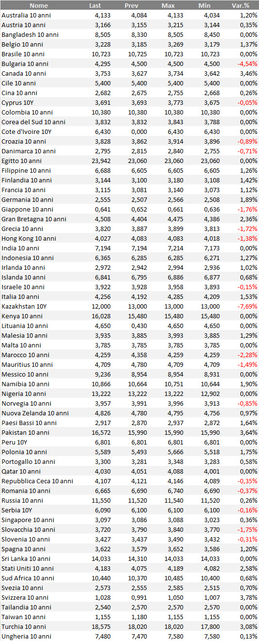 Consueta sezione dell’analisi sui mercati obbligazionari, con l’introduzione sotto forma di ranking dei bond governativi mondiali con qualunque rating. In alcuni casi, per alcuni emittenti o per alcune valute, il rapporto rischio/rendimento di questi bond può essere anche piuttosto speculativo. Il ranking considera i bond benchmark decennali in tutte le valute di emissione.