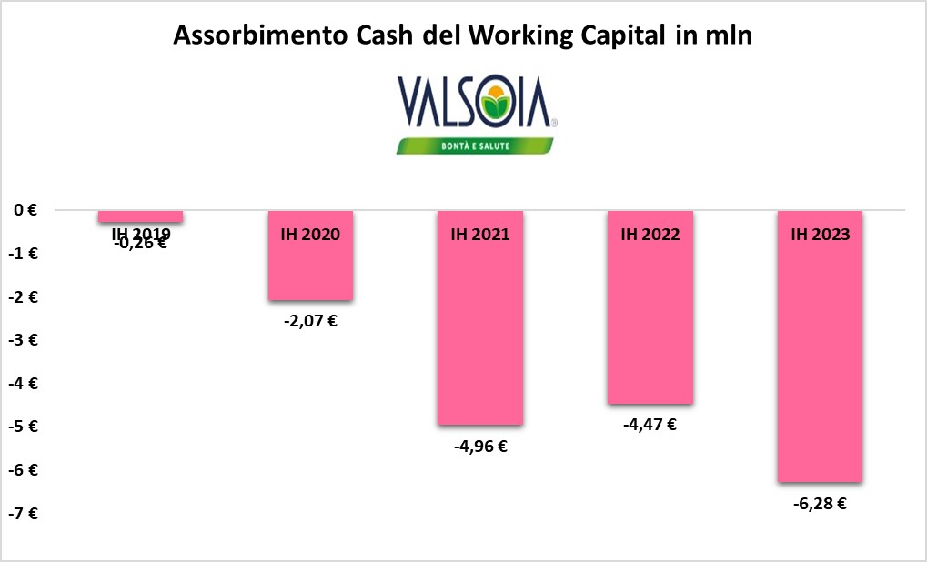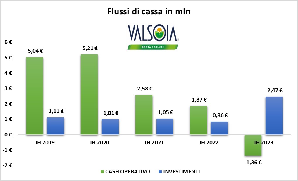 La diminuzione della marginalità si è riversata anche nell'ambito dei flussi cassa: per la prima volta, VALSOIA ha riportato un flusso di cassa operativo negativo.