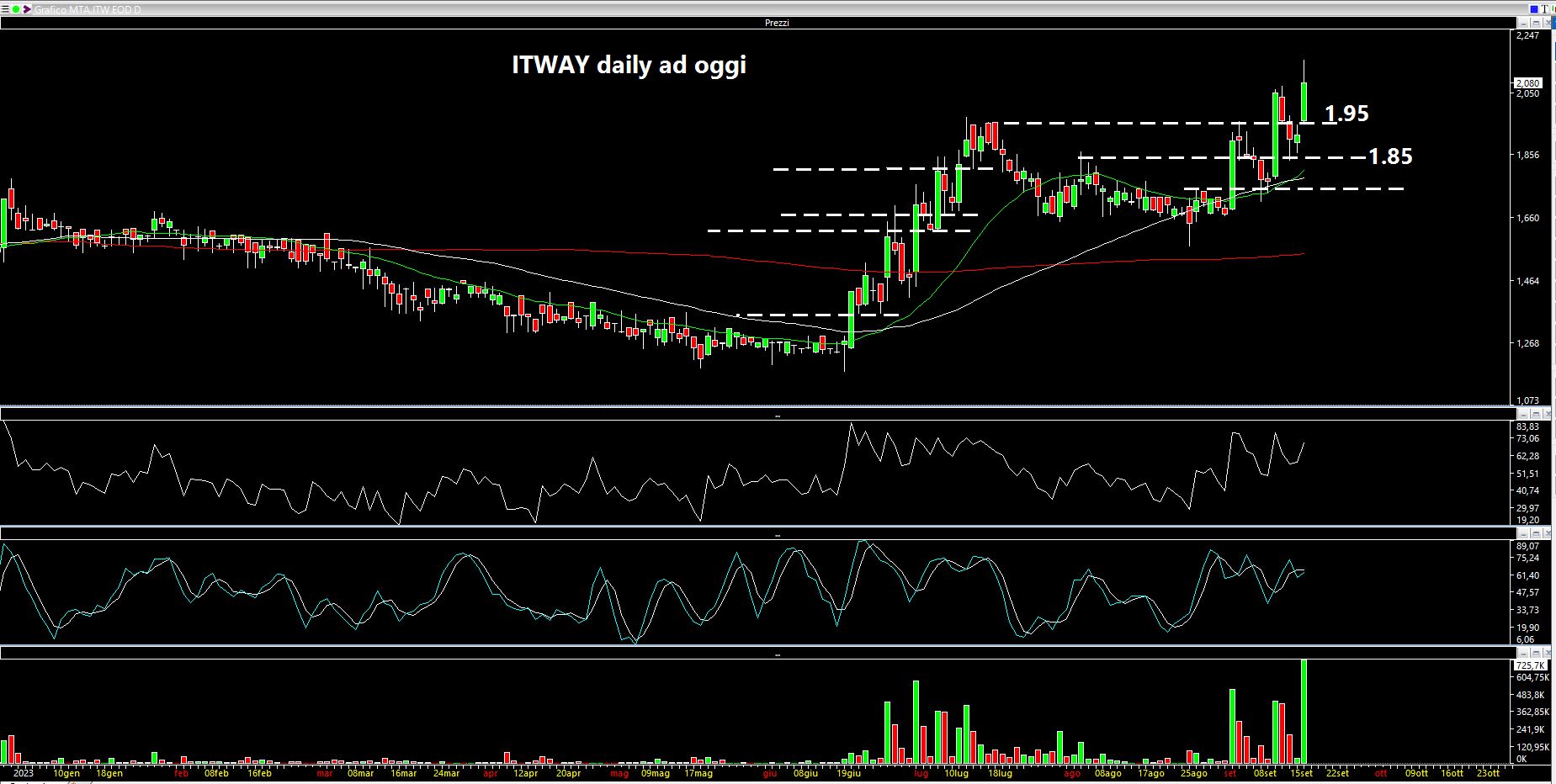 Ad oggi la situazione di ITWAY è la seguente: volumi ancora alti ma mi aspetto che la mano tolga le fiches dal tavolo per far rifiatare il titolo. Qualora i volumi diminuissero drasticamente (sotto i 100mila pezzi giornalieri magari per due o tre sedute consecutive) sarebbe un segnale di uscita indipendentemente dalle barre. E' stato comunque un ottimo trade sia come timing che come upside.