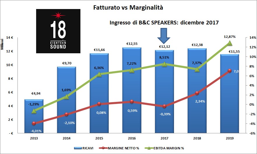 Nel passato, B&C SPEAKERS, in occasione dell'acquisizione di Eighteen Sound, ha impiegato un paio di anni per adeguarla ai propri standard di marginalità. Come si nota dal grafico qui sotto, a fine dicembre 2017 EIGHTEEN SOUND viaggiava ad una marginalità netta negativa con un Ebitda Margin % dell'8,51%; un paio di anni dopo la società ha realizzato un utile netto grazie ad un notevole aumento della marginalità operativa.