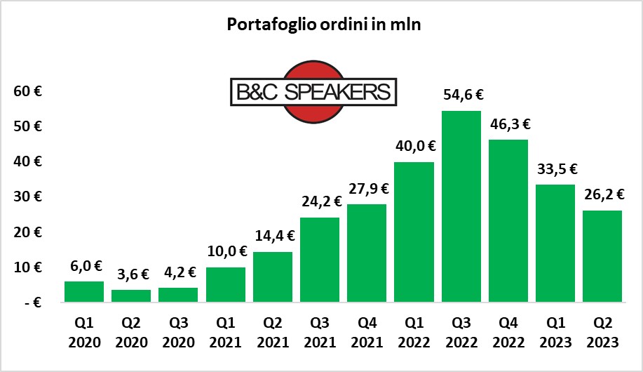 Il portafoglio ordini al 30 giugno 2023 risulta a quota € 26,2 mln, in discesa rispetto al trimestre precedente ma su tale aspetto ha impattato inevitabilmente l'eccezionale risultato evidenziato dai ricavi.