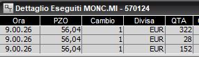 Se le azioni sottili sono oggetto di continue vendite, non è da meno l'andamento dei titoli principali. Penso ai titoli del lusso che hanno tenuto nei mesi scorsi e che ultimamente si sono indeboliti parecchio in Italia ma anche in Europa. Moncler ne è un esempio che mi ha permesso un bel trade nella seduta di martedì, con un buy esattamente sul minimo di giornata (ed un incremento della size in un suo intorno), ma si tratta di una operatività estrema: un modo per tirare fuori la pagnotta in un mercato che oggettivamente risulta estremamente difficile per il sottoscritto. Illiquidità, volatilità bassissima: il cocktail peggiore per un trader.