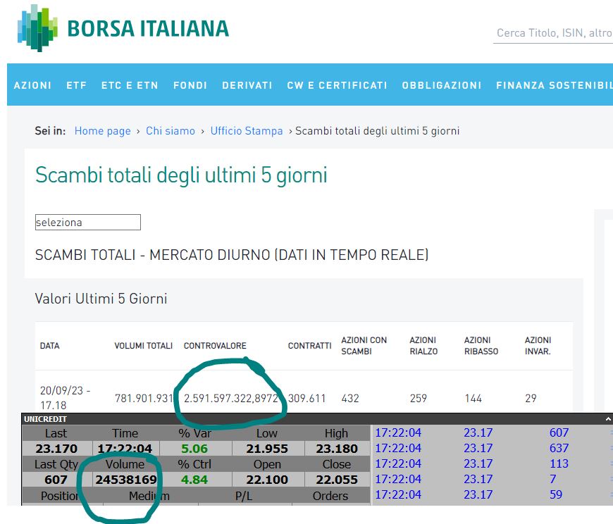 Quadro tecnico degli indici in deterioramento anche se il mercato italiano risulta apparentemente più tonico grazie al comparto bancario. La tenuta del nostro listino deriva quindi da poche azioni che pesano molto e che, come ho già avuto modo di far notare la scorsa settimana, risulta fuorviante anche in termini di volumi scambiati nel corso della seduta. All'inizio dell'articolo ho citato Unicredit. Mi è capitato di sentire commentatori affermare che i volumi erano risaliti a livelli ottimi. Questa affermazione a mio modo di vedere risulta essere estremamente fuorviante. A titolo di esempio il 20 settembre in finale di seduta (ore 17.39) il controvalore degli scambi era salito a 3.2 miliardi di euro. Peccato che analizzando a fondo il dato, alle 17.18 quel controvalore scendeva drasticamente a quasi 2.6 miliardi, il che significa che il 23% del totale è stato fatto SOLO in asta di chiusura. Andando ancor più nel dettaglio il 20% del volumi transato alle 17.20 era stato fatto SOLO dal titolo Unicredit. Di seguito trovate cerchiato il controvalore totale e lo potete confrontare con quello di Unicredit.