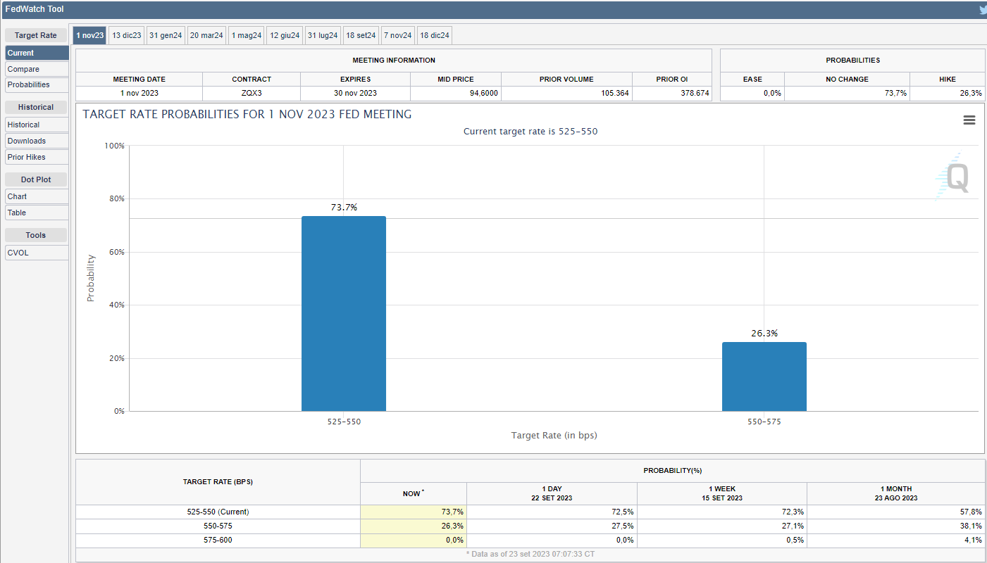Dopo la decisione della FED di lasciare i tassi invariati, come da dichiarazioni di Powell l’attenzione sarà tutta rivolta alle indicazioni presenti nei dot-plot e alle aspettative di crescita. Con quest’ultime previste in rialzo, il dot-plot dovrà trasmettere il messaggio di “higher for longer”. Pertanto se al momento rimangono stabili al 26,3% le percentuali per un ulteriore stretta di 25 bps per la riunione del primo novembre prossimo (v. grafico):