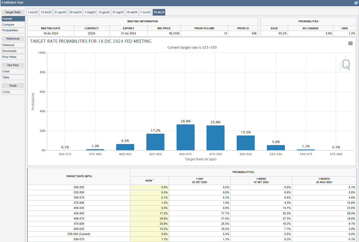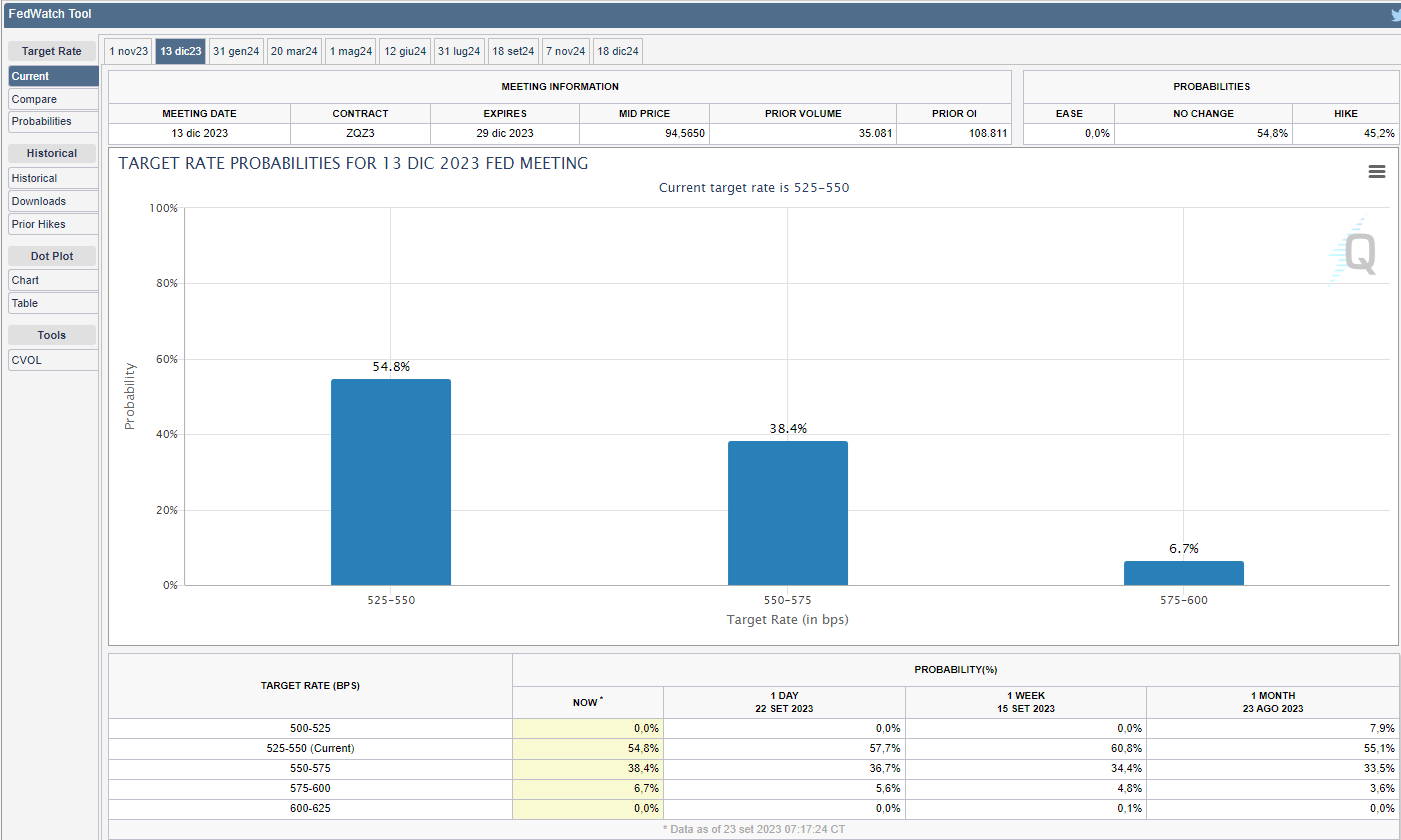 si sono leggermente alzate le probabilità al 38,4% di un aumento di 25 bps per l’ultima riunione del 2023 del 13 dicembre (v. grafico):