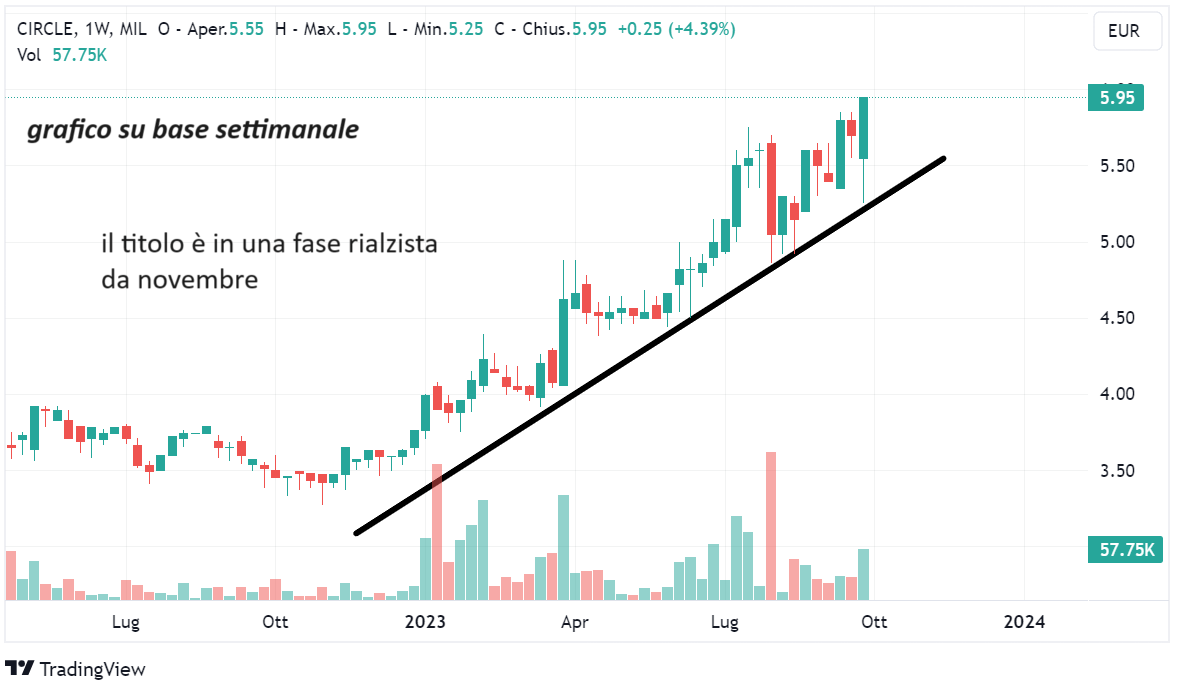 Proprio nella seduta di ieri, venerdì, ha chiuso sul massimo di giornata. Una quotazione di 5,95 che in realtà non rappresenta solo il massimo di giornata, ma il massimo storico. Stiamo parlando di Circle, titolo selezionato questo fine settimana dalla lista del Lombard Stock Index. Circle S.p.A. è una PMI fondata a Genova nel 2012 a capo di Circle Group, gruppo specializzato nell’analisi e nello sviluppo di prodotti per l’innovazione e digitalizzazione dei settori portuale e della logistica intermodale, ma anche nella consulenza internazionale sui temi del Green Deal e della transizione energetica. Il gruppo può contare sulla capogruppo Circle, sulle software house Info.era, Progetto Adele e Cargo Start, e sulle società di consulenza Circle Connecting EU e Magellan Circle. Circle S.p.A. è quotata sul mercato Euronext Growth Milan di Borsa Italiana dal 26 ottobre 2018.