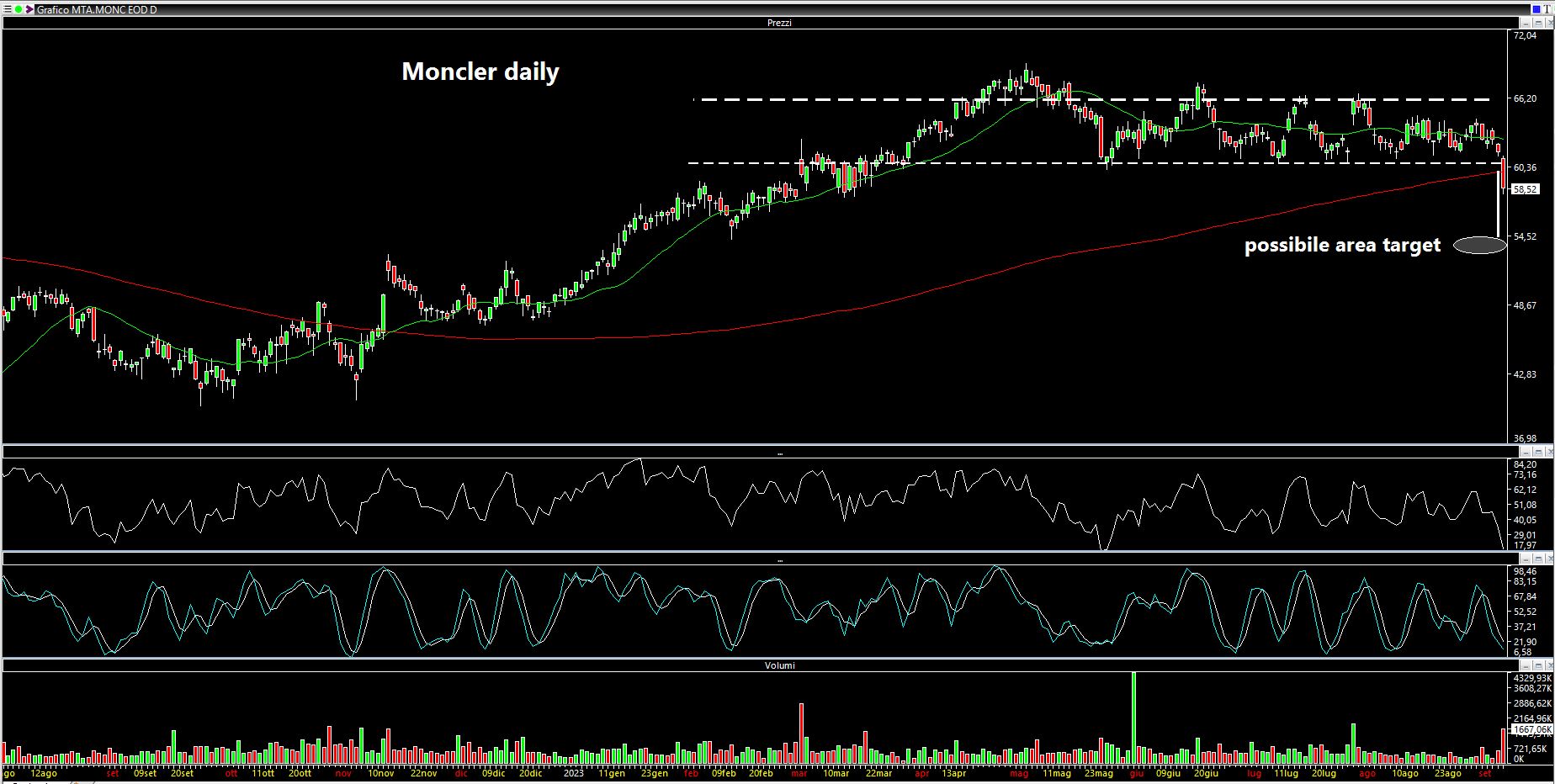 Brutto anche il comportamento del settore lusso, con Moncler in discesa del 5%. Ricordo che ne avevo scritto qualche settimana fa dal momento che aveva un'area supportile statica attorno a 60.50-61. Oggi l'ha bucata ed è scesa ben sotto la media a 200 di colore rosso. Se il rettangolo è stato da qualche mese 60 di base e 65-66 di altezza, ecco che proiettando verso il basso si ottiene un possibile target a 54.50-55.00.