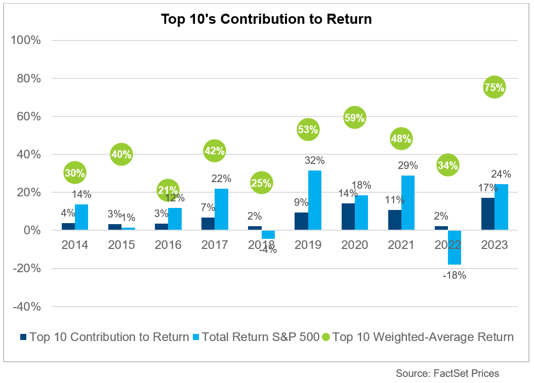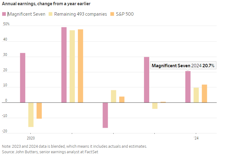 A livello di titoli, pochi prevedevano che la mania per l’intelligenza artificiale avrebbe aiutato a spingere le azioni a nuovi livelli. L’entusiasmo ha spinto al rialzo i titoli tecnologici, contribuendo a mascherare le scarse performance in altri settori del mercato. Nvidia è più che triplicata portandosi in testa ai guadagni dell'S&P500. I Magnifici Sette hanno sostituito l’indice FANG (o FAANG) come soprannome preferito per i leader del mercato. Nvidia, Apple, Microsoft, Alphabet, Amazon.com, Tesla, Meta Platforms.