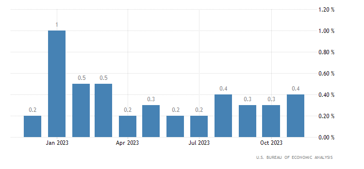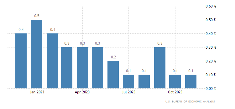 A livello annualizzato, a novembre è stato registrato un +3,2%, anche in questo caso quasi in linea con il consensus del +3,3%. Ad ottobre la crescita era stata del 3,4% (rivista da +3,5%). I dati sono rilasciati dall’U.S. Bureau of Economic Analysis.