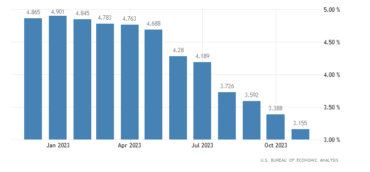 I dati sui consumi personali statunitensi di venerdì 22 dicembre hanno mostrato che i prezzi statunitensi sono scesi a novembre per la prima volta in più di 3 anni e mezzo, spingendo l’aumento annuo dell’inflazione ulteriormente al di sotto del 3%.