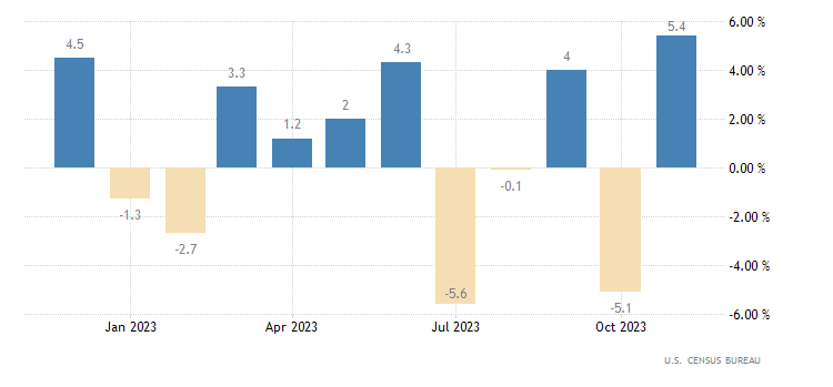 Gli ordini di beni durevoli a livello mensile a novembre crescono del 5,4%. Ad ottobre era stata registrata una contrazione del 5,1% (rivista da -5,4%). Il dato è rilasciato dall’U.S. Census Bureau.