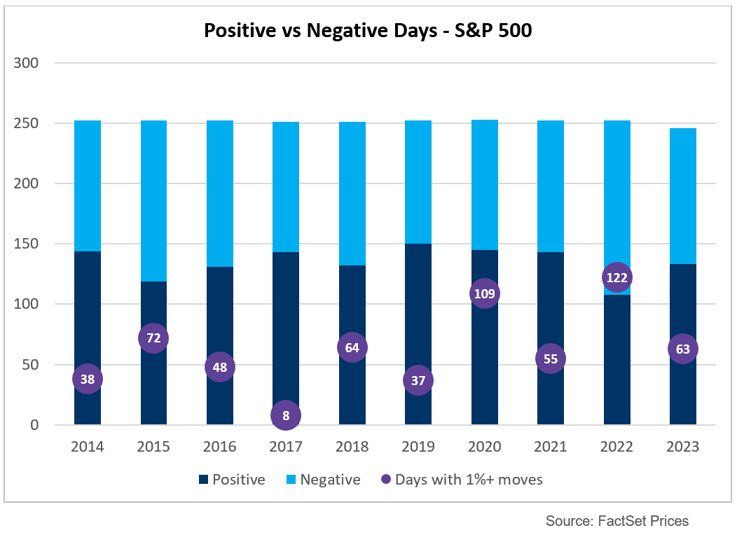 Nel 2023, l’S&P500 si è ripreso dal difficile contesto del 2022 che aveva visto un calo di oltre il 19% con picchi del 25% circa. Nel 2022 l’indice S&P500 ha registrato 122 giorni di negoziazione con oscillazioni superiori all'1% e il 2023 è terminato con circa la metà di quel numero (il 20 dicembre è stato l’ultimo giorno di forte oscillazione con il conteggio arrivato a 63), che è più in linea con la media decennale di 59.