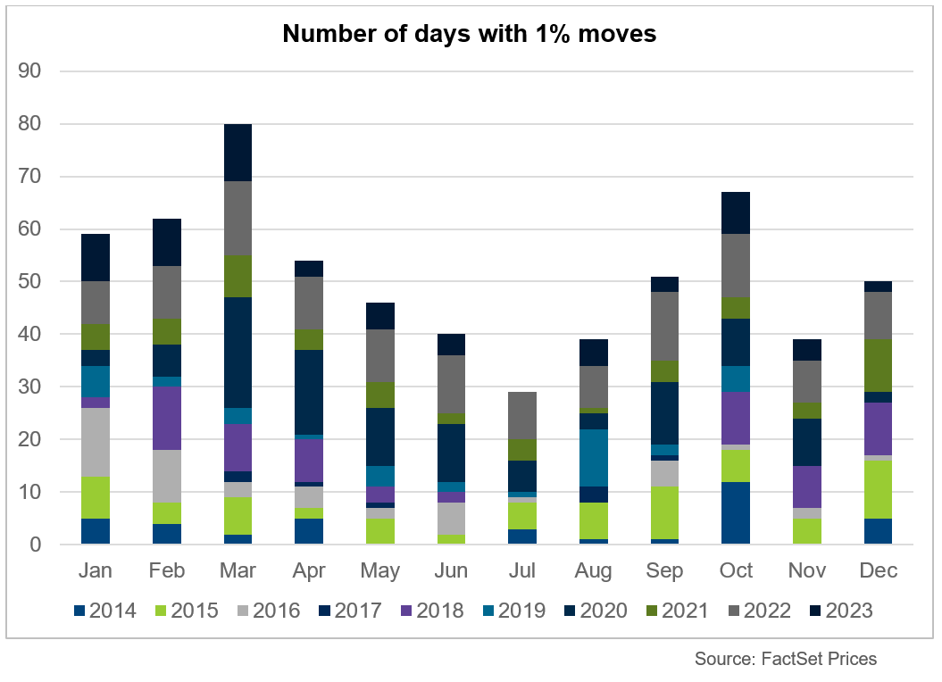 In linea con una tendenza decennale, nel 2023 l’indice S&P500 ha registrato la maggior parte della sua volatilità nel primo trimestre, con gennaio, febbraio e marzo che hanno rappresentato cumulativamente 29 giorni con movimenti di prezzo superiori all’1%. Il modello di maggiore attività nella prima parte dell’anno è stato accompagnato da un’estate più tranquilla, con luglio che non ha registrato giorni che hanno superato la soglia dell’1% e agosto solo cinque, supportando la tendenza stagionale di ridotta volatilità durante questo periodo. Tradizionalmente, la calma estiva può essere attribuita a volumi di scambi inferiori poiché i partecipanti al mercato si ritirano per le vacanze. Ottobre si è distinto ancora una volta con otto giorni di negoziazione significativi, sottolineando la tendenza storica degli aggiustamenti di mercato di fine anno e delle reazioni agli sviluppi fiscali e politici (v. grafico):