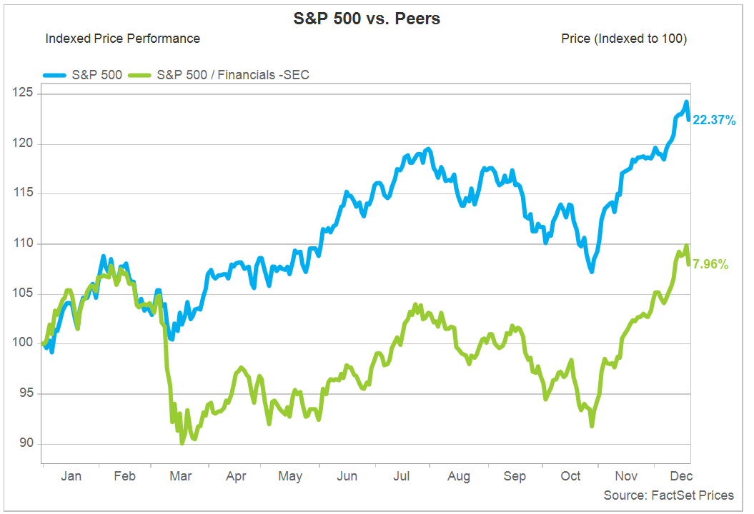 Il secondo giorno peggiore dell'anno è stato il 9 marzo, quando l'indice S&P 500 ha subito una significativa svendita, perdendo l'1,85%. Questa flessione è stata in gran parte attribuita alle crescenti preoccupazioni sul valore dei portafogli obbligazionari delle banche statunitensi, esacerbate dall'annuncio di SVB Financial Group di un'offerta di azioni ordinarie da 1,75 miliardi di dollari e di un'offerta preferenziale convertibile da 500 milioni di dollari. Il settore finanziario ha affrontato un anno tumultuoso nel 2023 e ha recuperato il forte calo nel primo trimestre dell’anno, riflettendo le sfide del settore bancario in generale. Nonostante le difficoltà di inizio anno, il settore ha dimostrato resilienza, recuperando un aumento del 7,96% nella performance dei prezzi da inizio anno e un rialzo del 13,59% dalla fine di ottobre. La crisi bancaria, segnata dal collasso di numerose banche importanti, ha provocato un'onda d'urto nel settore. Le perdite nella criptovaluta, il calo dei portafogli obbligazionari e immobiliari commerciali e le significative corse agli sportelli hanno catalizzato la caduta di istituzioni come Silvergate Bank e Silicon Valley Bank, tra le altre. Le azioni decisive della Federal Reserve, tra cui la fornitura di prestiti di emergenza e la garanzia del recupero dei depositi, sono state determinanti nella stabilizzazione del settore finanziario durante la crisi bancaria del 2023 (v. grafico):