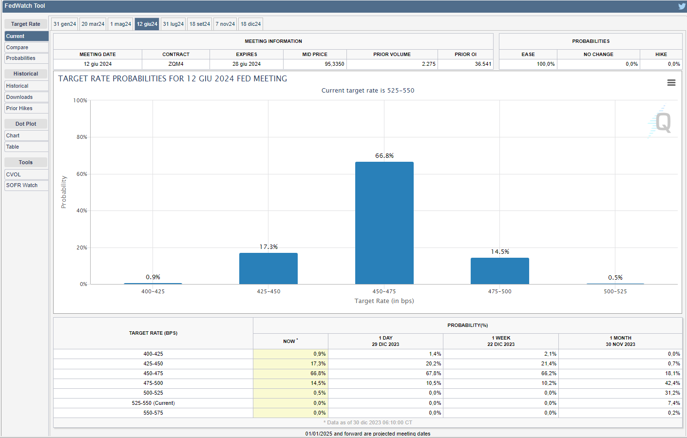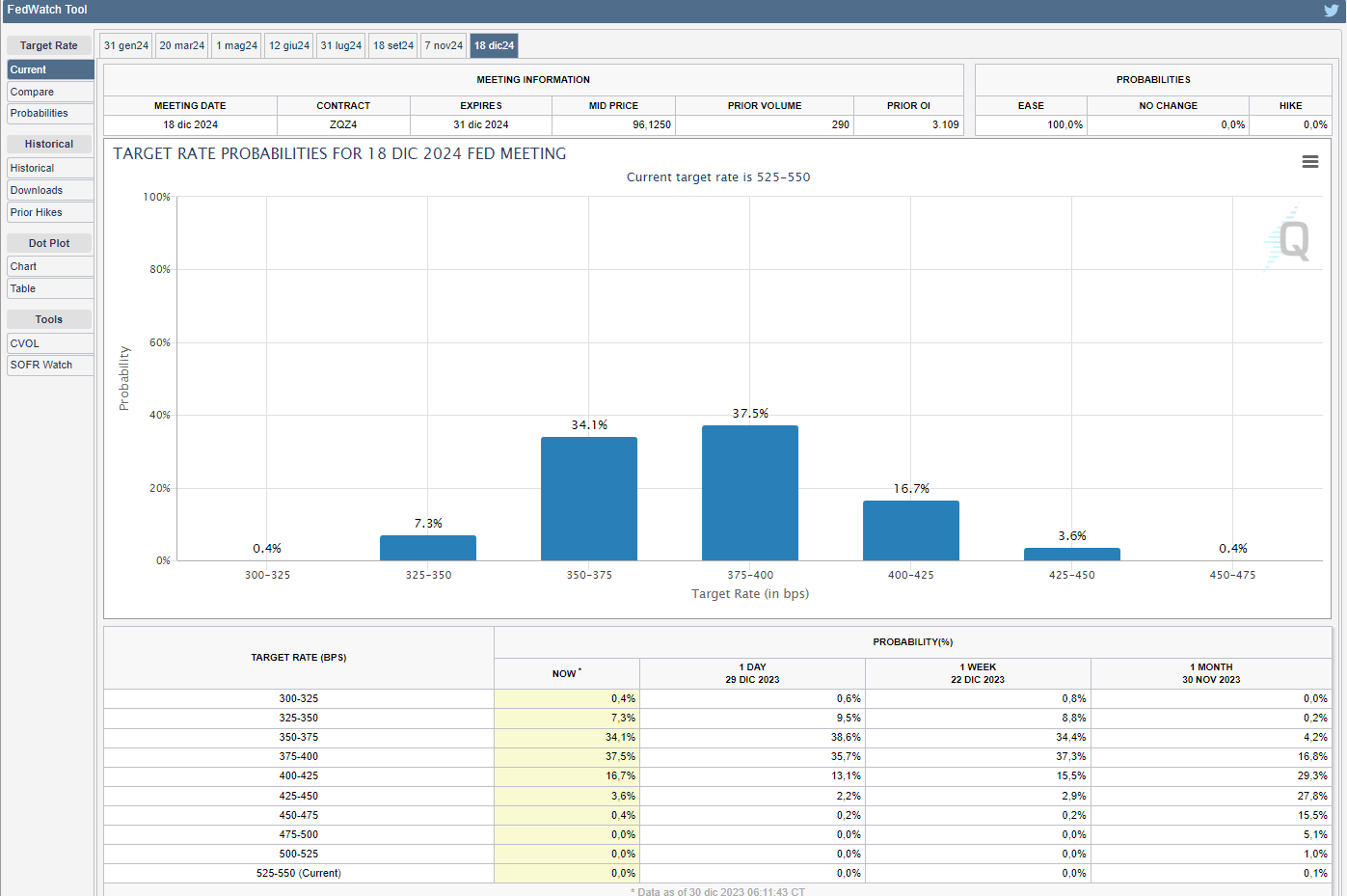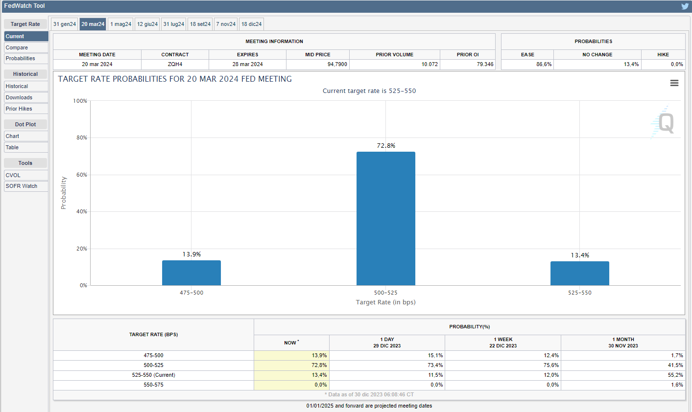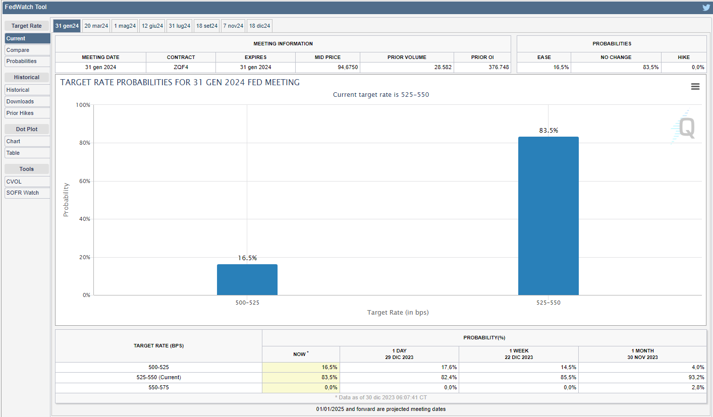 Lo strumento FedWatch del CME Group mostra come i mercati, per la prima riunione del 2024 in programma il 31 gennaio, iniziano a prezzare una modesta ma crescente probabilità del 16,5% di uno sconto di 25 bps contro il 14,5% di due venerdì fa (v. grafico):