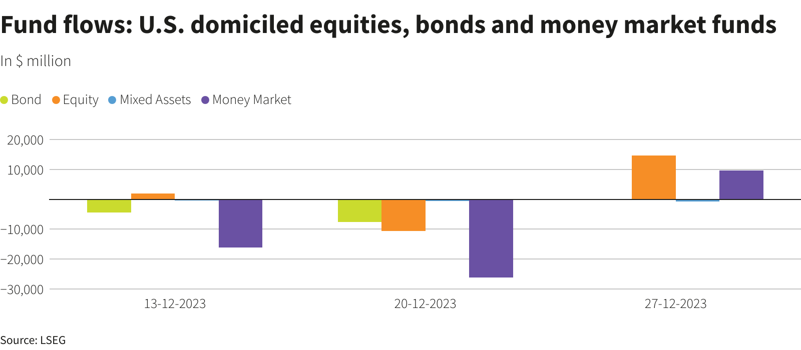 I fondi azionari statunitensi hanno attirato massicci afflussi nella settimana terminata il 27 dicembre, sostenuti dalle aspettative di tagli anticipati dei tassi da parte della Federal Reserve dopo che i dati hanno mostrato un ulteriore raffreddamento dell'inflazione a novembre.