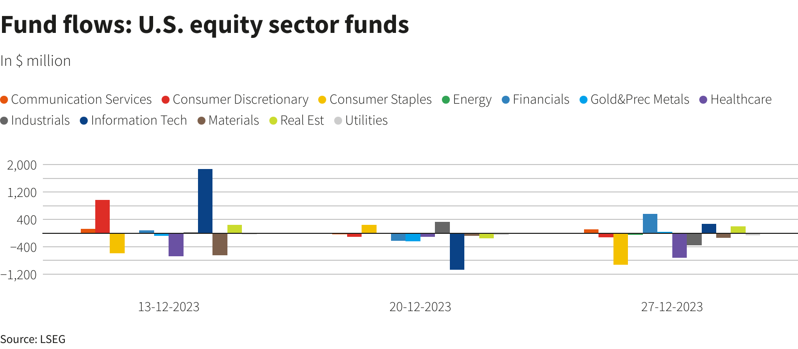 Nel frattempo, i fondi azionari settoriali statunitensi hanno registrato deflussi per circa 1,19 miliardi di dollari, con beni di prima necessità e sanità che hanno registrato rispettivamente 924 milioni di dollari e 721 milioni di dollari di vendite nette.