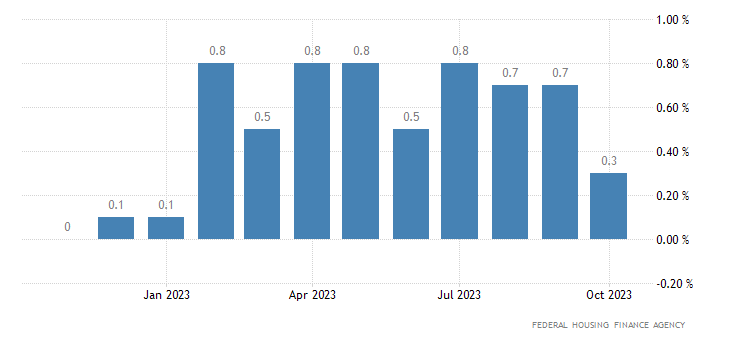L’indice di prezzo delle case a livello mensile segna una crescita dello 0,3%, passando dal dato di 414,9 punti di settembre (rivisto da 414,8 punti) a quello di ottobre di 416,3 punti. Il dato è rilasciato dalla Federal Housing Finance Agency.