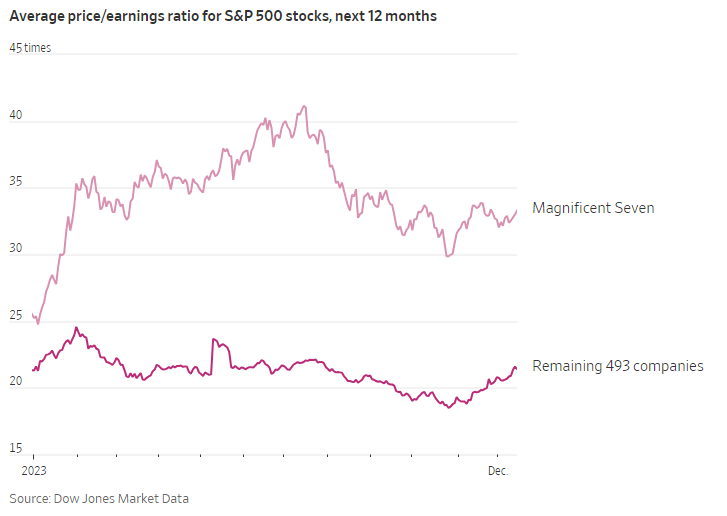 Collettivamente, le azioni conosciute come i Magnifici Sette: Apple, Microsoft, Alphabet, Amazon.com, Nvidia, Tesla e Meta Platforms, sono balzate del 75% nel 2023, lasciando nella polvere le altre 493 società dell’indice S&P500. (Queste sono aumentate di un più modesto 12%, mentre l’indice nel suo complesso è cresciuto del 24%). Ciò ha lasciato alcuni strateghi preoccupati per il ristretto rally e per le valutazioni imposte da tali titoli. Nvidia, ad esempio, viene scambiata a circa 25 volte gli utili previsti per i prossimi 12 mesi (non molto a dire la verità, ndr.), mentre l’S&P500 viene scambiato a circa 20 volte gli utili futuri, al di sopra delle sue medie storiche.