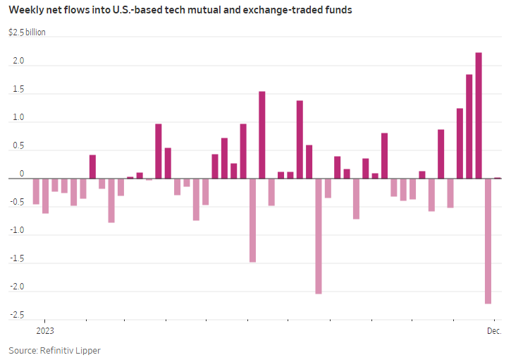 Anche gli investitori appaiono cauti. Sebbene abbiano aggiunto 4,1 miliardi di dollari netti ai fondi comuni di investimento azionari e quotati incentrati sulla tecnologia fino a novembre di quest’anno, si tratta di circa la metà dei circa 7,9 miliardi di dollari che hanno raccolto nello stesso periodo del 2022, come mostrano i dati di Refinitiv Lipper (v. grafico):
