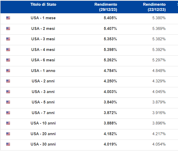 E veniamo ai numeri dei rendimenti dei Treasury che nelle ultime due settimane hanno continuato a scendere fino a far registrare nuovi minimi relativi che riportano i valori a maggio 2023. Nello specifico, la scadenza corta del 2 anni ha fatto registrare mercoledì scorso un minimo al 4,231% per poi chiudere l’anno al 4,25%. Stessa cosa per il Treasury 10Y con un minimo di mercoledì scorso al 3,783% per poi rimbalzare un po' chiudendo l’anno al 3,866%. Infine anche il rendimento del 30Y tocca un minimo del 3,942% per poi chiudere l’anno al 4,019%. Lo spread 2Y-10Y si riduce nuovamente sotto i 40 bps (v. grafico):