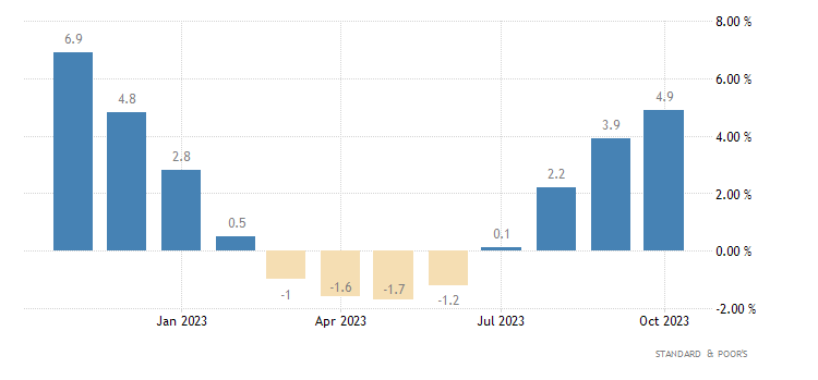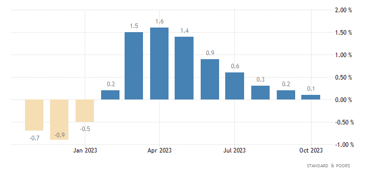 L’S&P/Case-Shiller Home Price Index rilasciato da Standard & Poor’s, che valuta le variazioni nel valore del mercato immobiliare residenziale in 20 regioni degli USA, a livello mensile ad ottobre segna un +0,1%, dopo il +0,2% di settembre.