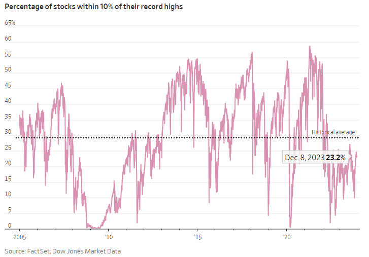 Microsoft ha registrato un rally del 55% nel 2023, con le azioni che hanno raggiunto livelli record a novembre. Apple ha guadagnato il 52% e in giugno è diventata la prima azienda statunitense la cui valutazione ha superato i 3mila miliardi di dollari. Le azioni di Nvidia sono più che triplicate, spingendo il suo valore di mercato sopra i mille miliardi di dollari. Pochi altri titoli hanno tenuto il passo. Sebbene l’S&P500 sia solo all’1,02% rispetto al record di gennaio 2022, secondo Dow Jones Market Data solo il 23% dei titoli azionari nell’indice si trova entro il 10% dei massimi storici. Questo è inferiore alla media storica del 28%.