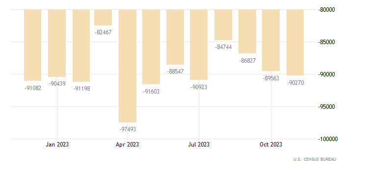 Il dato preliminare di novembre relativo alla bilancia commerciale di beni è pari a -90,27 miliardi di dollari, contro un dato di ottobre di -89,56 miliardi. Il dato è rilasciato dall’U.S. Bureau of Economic Analysis.